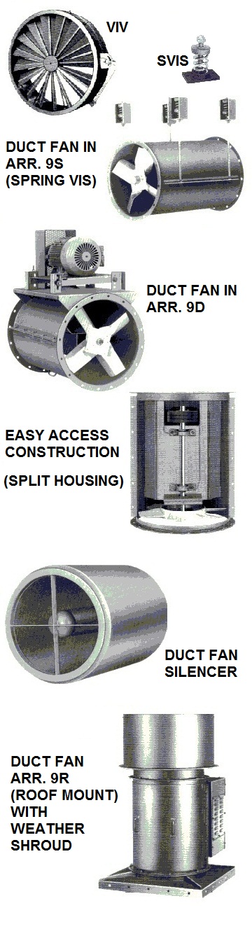 Duct fan: axial flow through fan designed for low pressure building ventilation and industrial process application. Uses include heat, smoke, and fume removal; process ventilation and process air handling; proces drying with ambient or preheated up to 650 F air; comfort process cooling and general ventilation of buildngs. Available in direct drive arrangements 4/4M/4V/4D/4R and corresponding belt drive arrangements 9/9M/9V/9D/9R. Capacities: to 350,000 CFM. Static pressure to 1.5 inches water gauge.